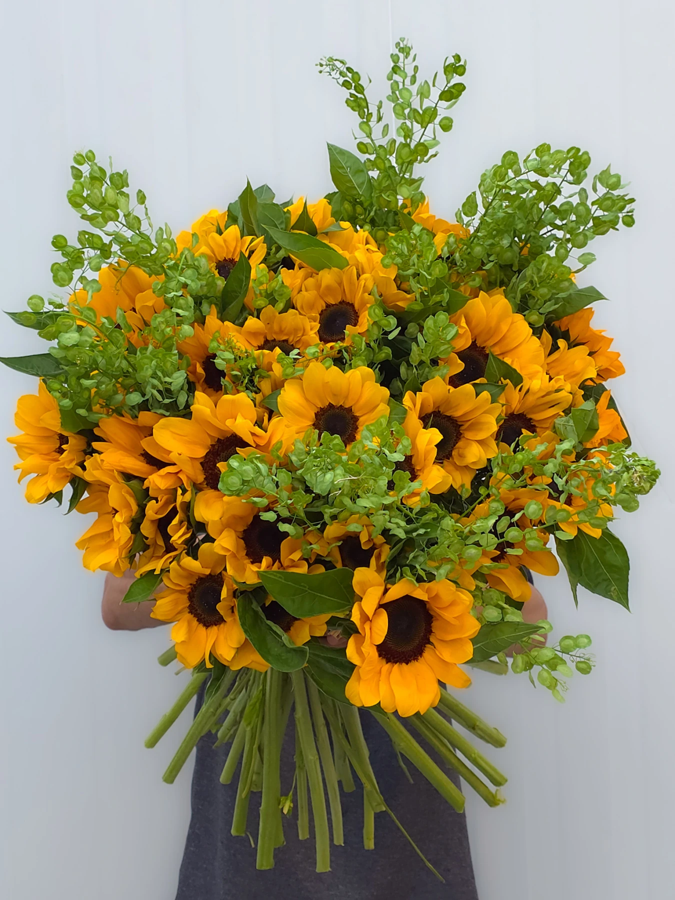 40 sunflowers in a wild field-style arrangement with seasonal greenery.