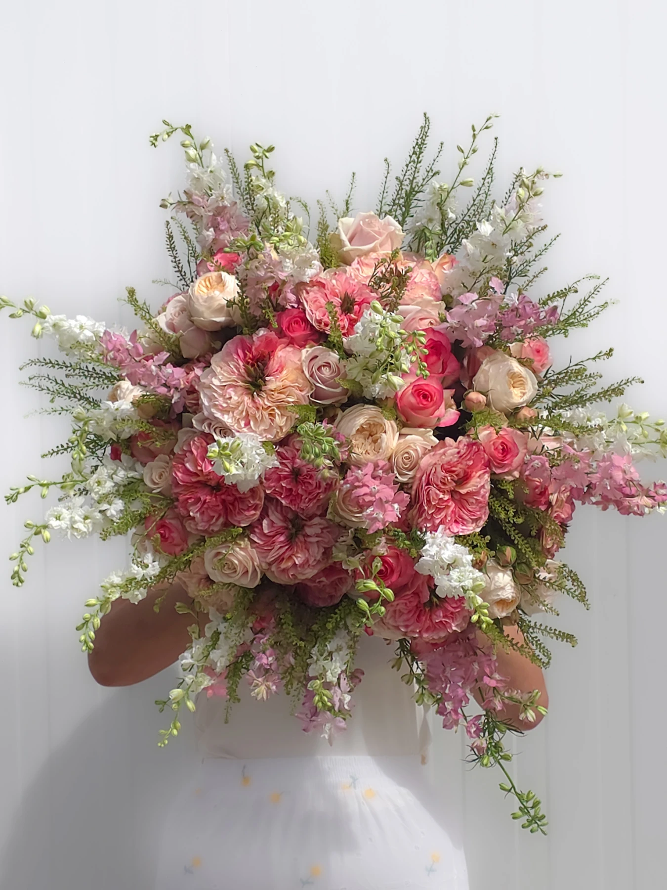 A romantic and luminous bouquet of 90 pink roses, gently combined with delphinium and seasonal foliage.